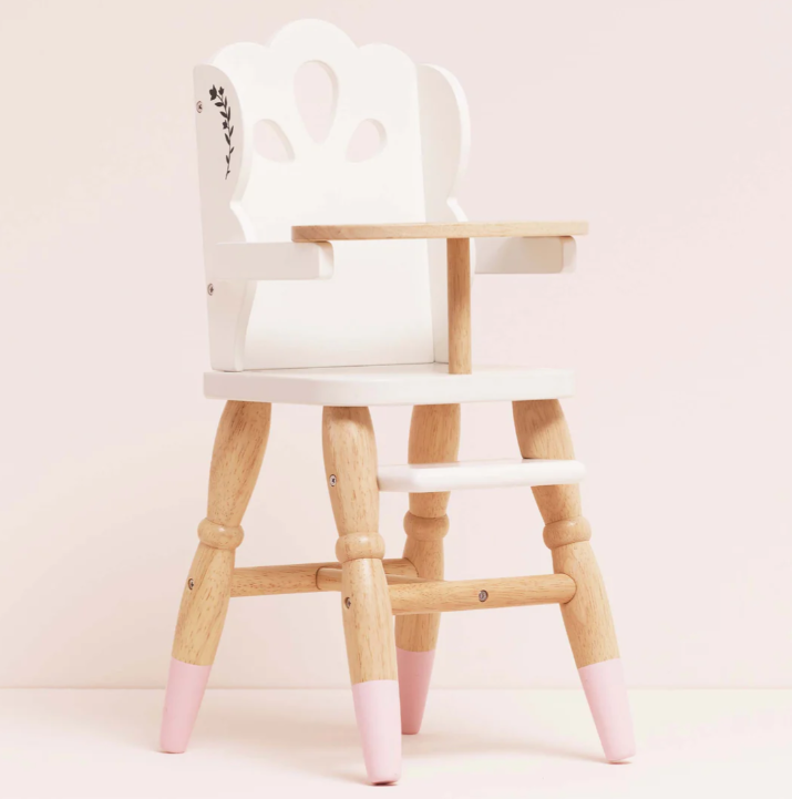 Each high chair is lovingly crafted from sustainable FSC® certified wood and hand-painted in delicate, classic tones. From its spindle-turned legs and floral cut-out backrest to its miniature tray table and footrest, every detail reflects the craftsmanship and charm that Le Toy Van is known for. It’s the perfect setting for bunny’s breakfast, teddy’s tea party, or dolly’s dinner date!