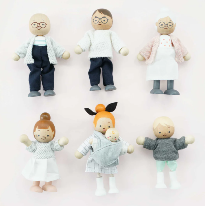 Each wooden figure is beautifully painted, featuring poseable limbs and soft fabric outfits that invite hours of imaginative storytelling. Whether they’re gathered around for tea, tucking the baby in for bedtime, or embarking on little adventures, they’ll inspire creativity and nurture empathy with every play session.