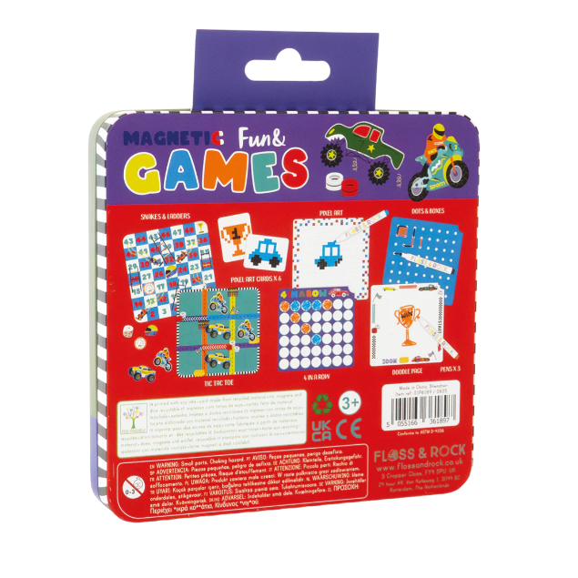 - Includes a reusable magnetic tin featuring six games, magnetic pop-out pieces, 3 colourful dry-wipe pens with erasers and a dice for interactive gameplay