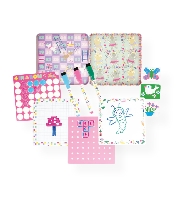 - Includes a reusable magnetic tin featuring six games, magnetic pop-out pieces, 3 colourful dry-wipe pens with erasers and a dice for interactive gameplay