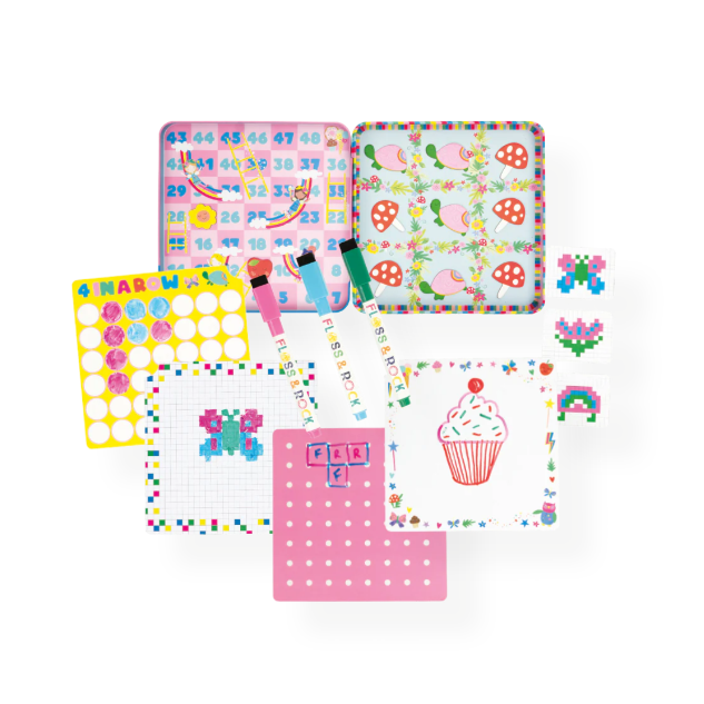 - Includes a reusable magnetic tin featuring six games, magnetic pop-out pieces, 3 colourful dry-wipe pens with erasers and a dice for interactive gameplay