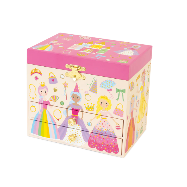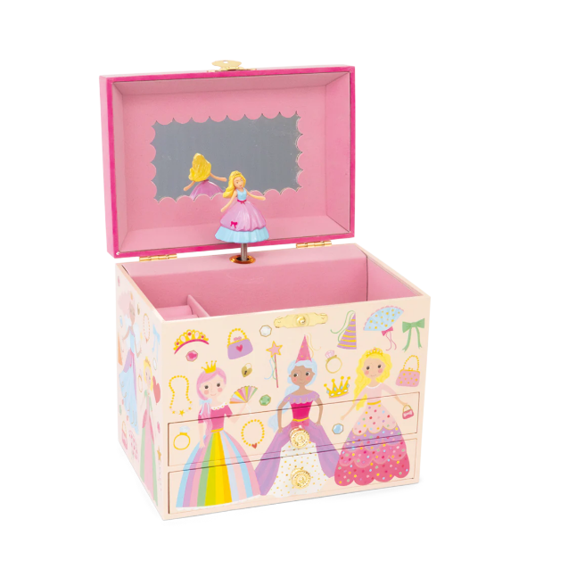 - Includes a beautifully illustrated musical jewellery box with princess and royal motif designs a twirling princess figurine that dances to “Carousel Waltz” a scalloped mirror for a touch of sparkle and reflection, a spacious top compartment for jewellery and treasures and 2 pull-out drawers with golden knobs for organised storage