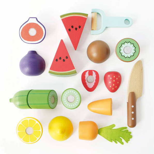 - Includes a natural wooden chopping board, a child-safe knife, a peeler, and a mix of colourful sliceable fruits and vegetables that each join with Velcro, creating realistic cutting sounds and a satisfying tactile experience