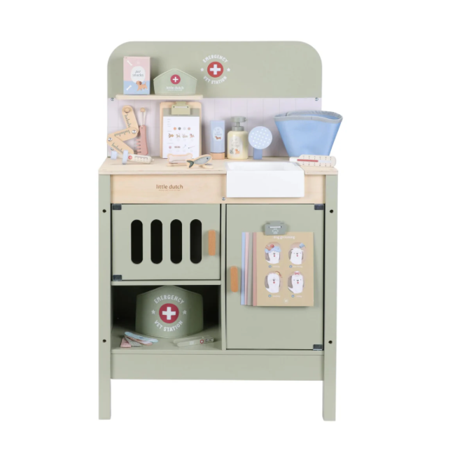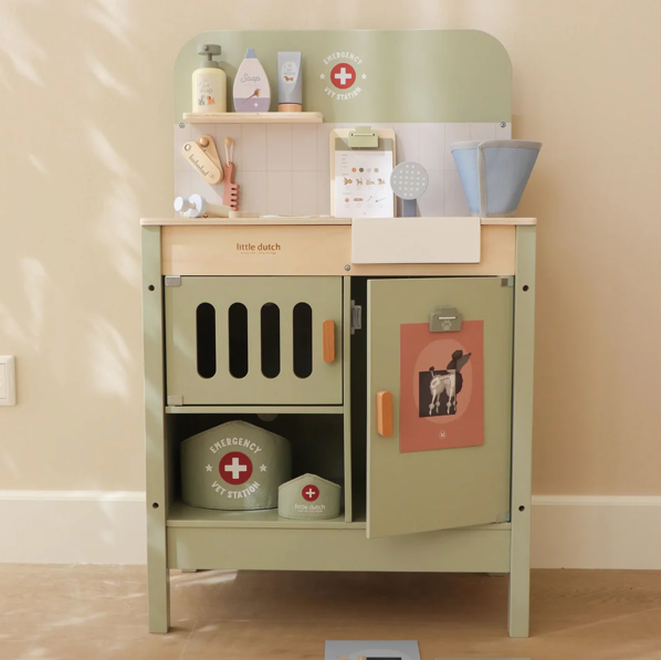 Set up your very own animal clinic with the Little Dutch Wooden Veterinary Practice — the sweetest spot for little carers to treat cuddly patients, bandage bumps and bruises, and give the very best care to their furry friends.